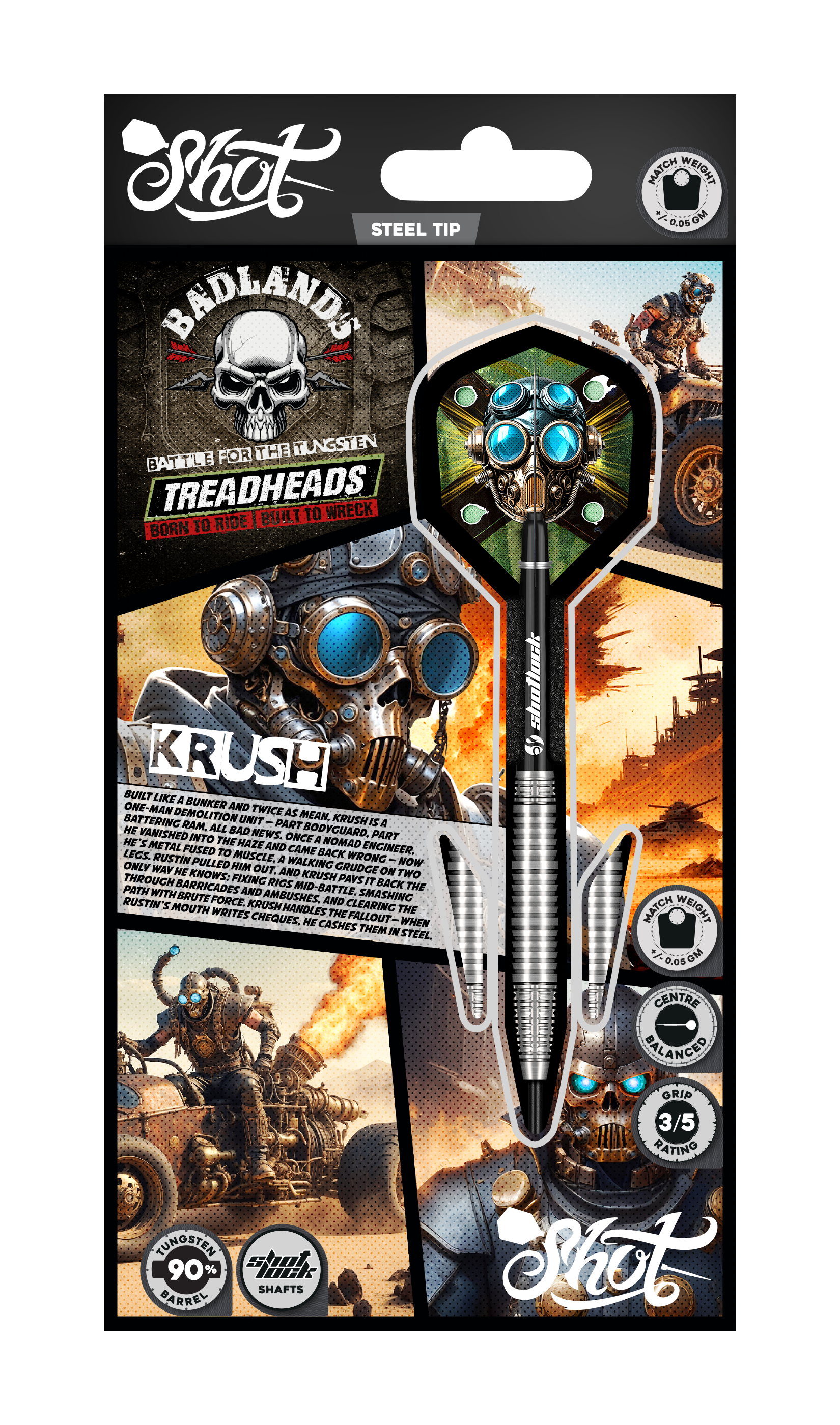 Forged from the wreckage of a world gone wild, the Badlands series storms into the arena with pure brute force. Across the scorched earth, road warriors and renegades battle for dominance and in this wasteland, tungsten reigns supreme. Tougher than steel and built to outlast chaos, Krush is a one-man wrecking crew metal fused with muscle, engineered for destruction.