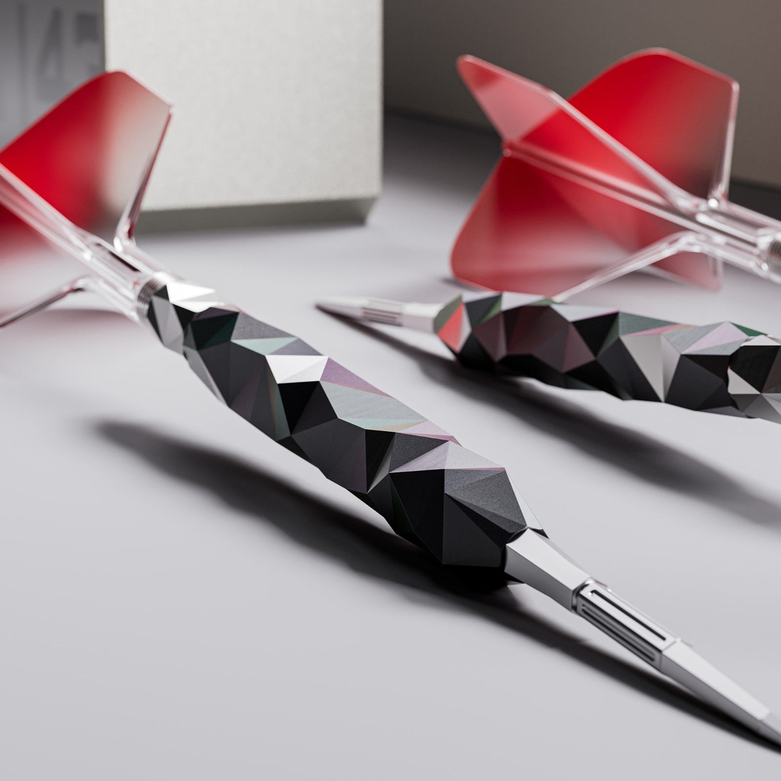 Completing the set is a bespoke dart stand, crafted from premium silver-coated aluminium. Designed with the same bold, angular identity as the Archetype project, this exclusive stand is both a functional display piece and a statement of design.