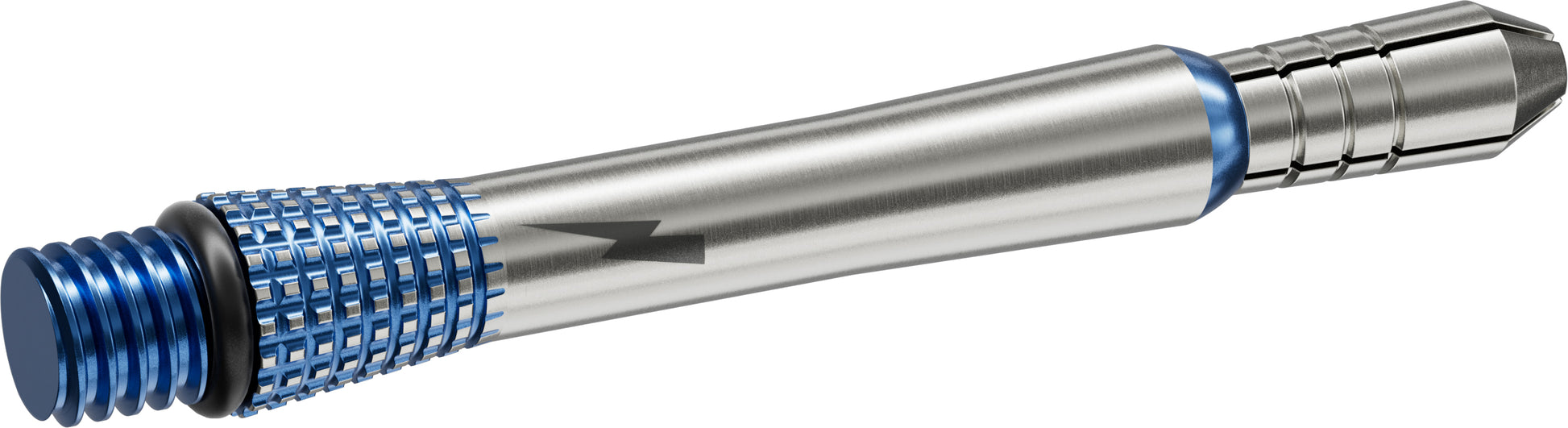 Crafted from lightweight aluminium with a durable blue titanium nitride coating, the shaft, with precision-engineered design at the rear provides a secure grip and consistent flight path. Equipped with a 2BA universal thread, these shafts can be paired with any 2BA thread dart barrel.