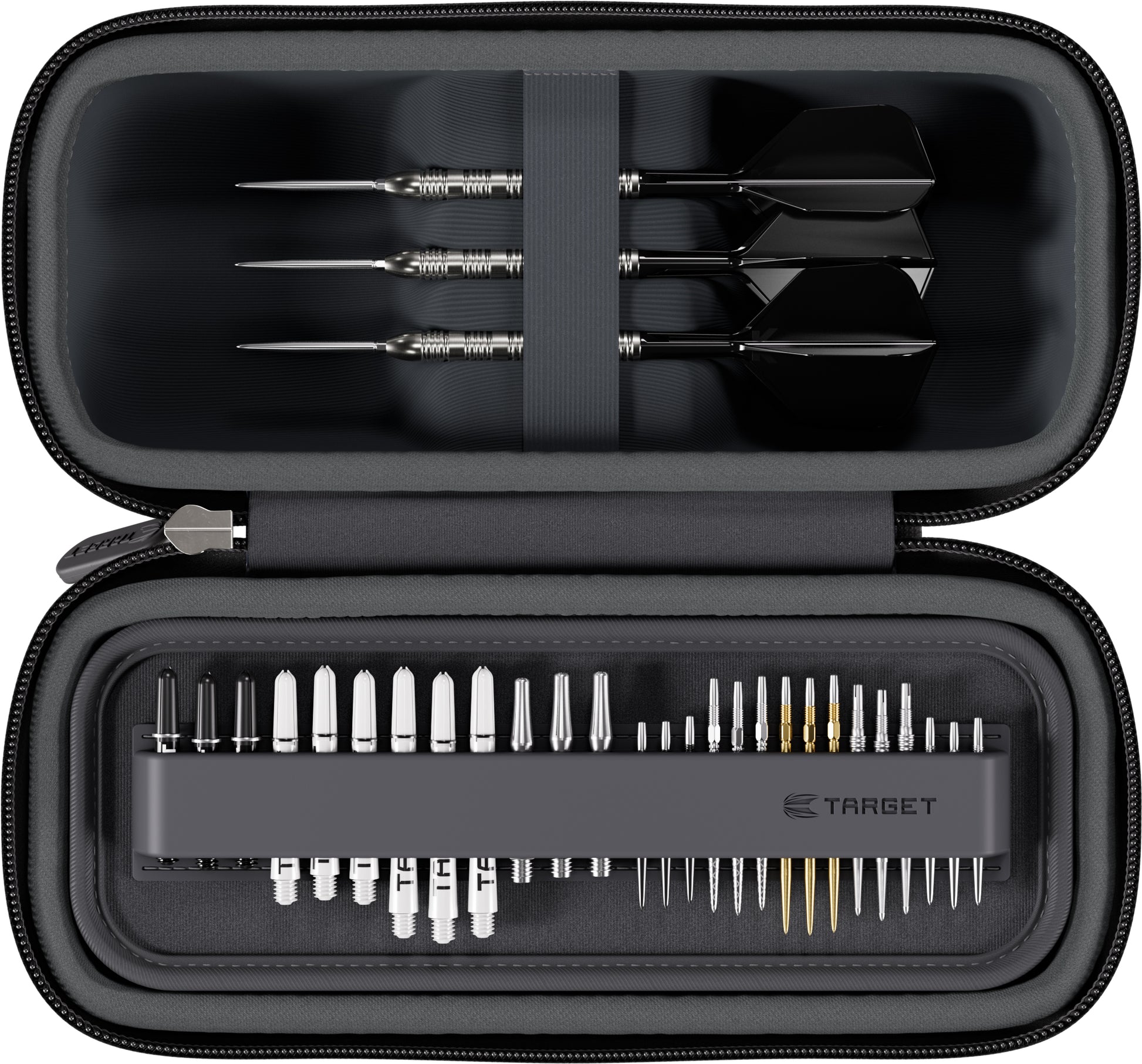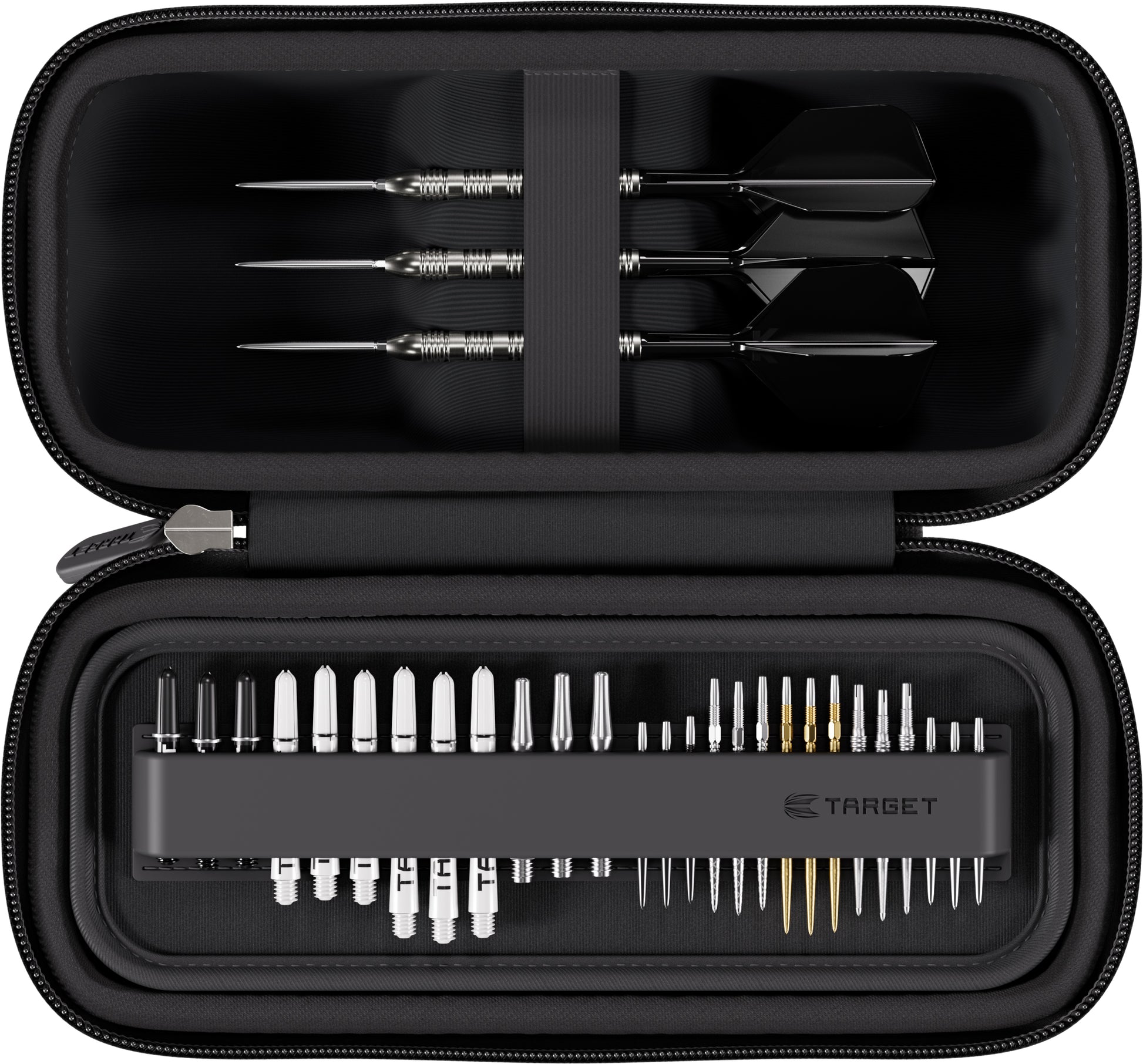 The case comfortably houses up to 6 fully assembled darts, eliminating the need to disassemble your setup between games. An internal tray system allows storage for 12 dart shafts and 15 Swiss Point tips, while additional compartments provide space for flights, K-Flex accessories, Swiss Point tools, and other essentials.