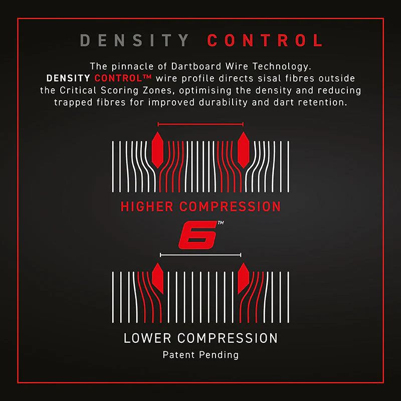 The Blade 6 dartboard delivers outstanding playability, durability and performance. The uniform density on the outer core and the high visibility playing surface increases scoring potential and provides perfect vision Blade’s pioneering web design features the latest ‘Density Control™’ for optimum fibre density and improved dart retention in the double, treble and bullseye zones, for maximum scoring power, Patent Pending.